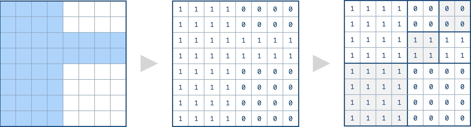 给定下面这个8 x 8 网络,我们将这样建立一个对应的四叉树: